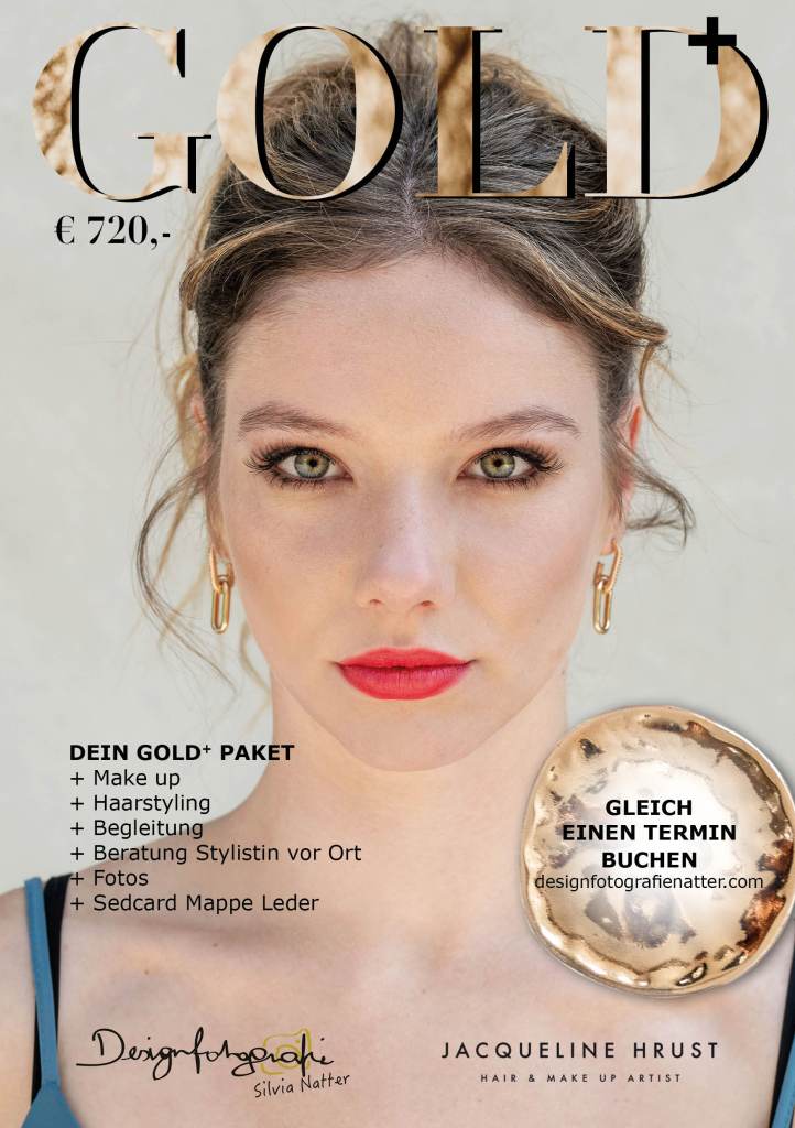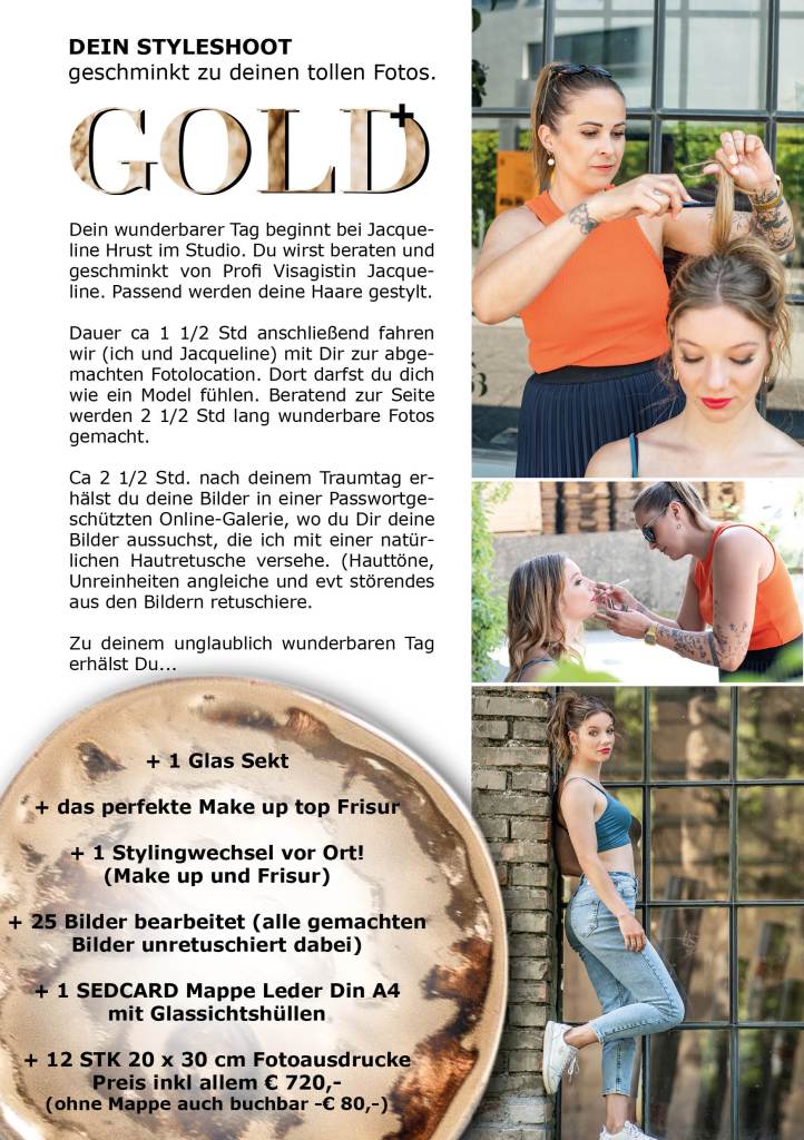 Dein Gold Paket – beginnt bei Visagistin Jacqueline Hrust in Ihrem Studio in Wolfurt. Du wirst gestylt und geschminkt. Sie berät dich gerne und schminkt dich passend zu deinem Typ bzw wünschen. Anschließend machen wir bei der abgemachten Location wunderbare Bilder.